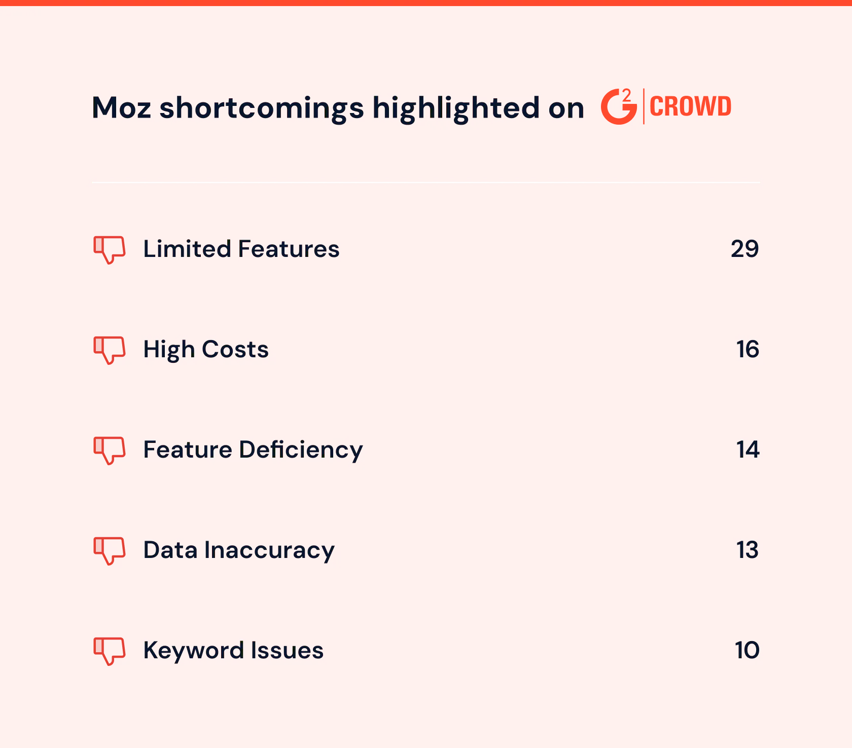 A verified Moz user on G2 says"Hard to get clear, unequivocal data about performance… too much interrogation and interpretation required."